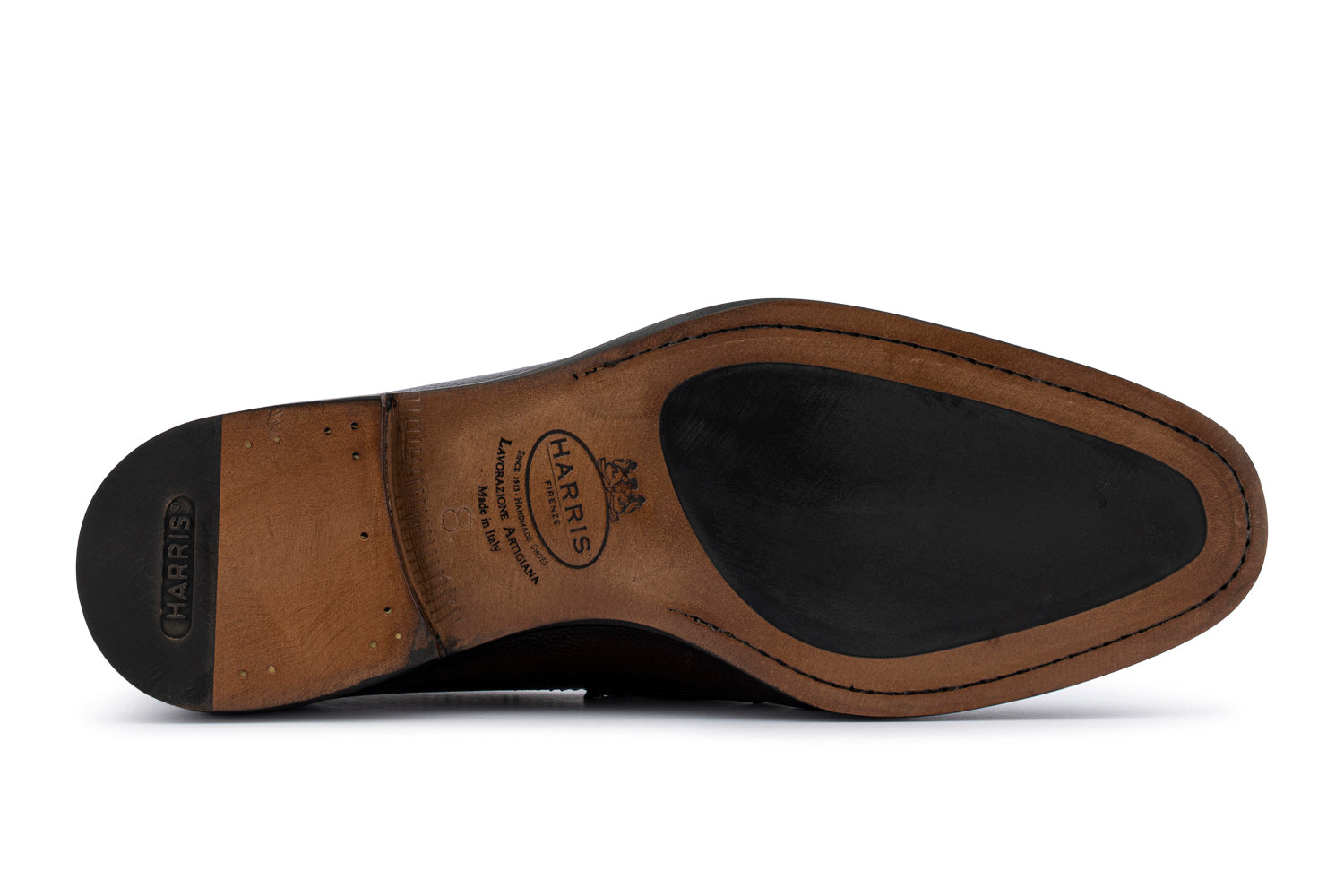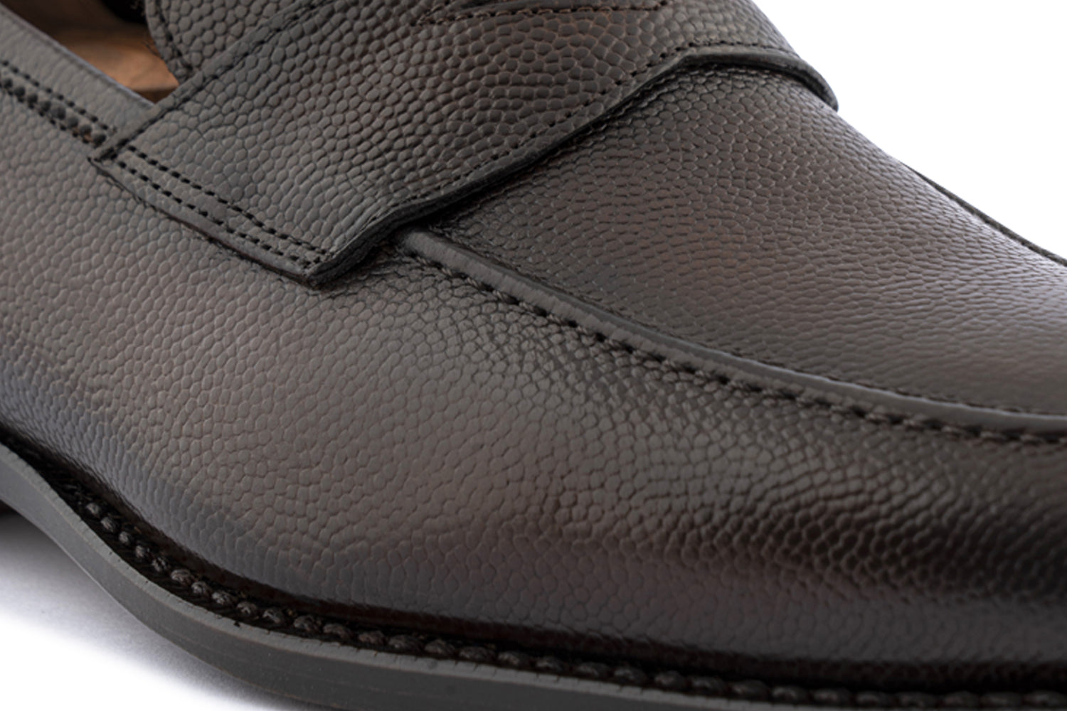 Mocassino in pelle pieno fiore stampata chicco di riso, lavorato a mano in un profondo marrone scuro con leggere sfumature di colore che simboleggiano la finitura artigianale mentre il passante in pelle aggiunge un tocco classico e discreto. Realizzato con lavorazione Blake Rapid è completato da una suola in cuoio con inserto antiscivolo che conferisce carattere, eleganza e comfort.