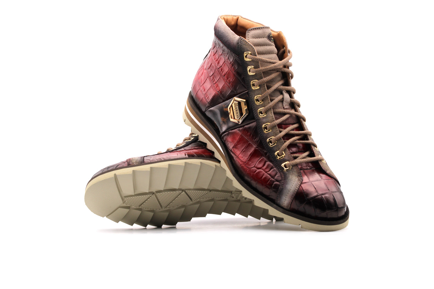 La profundidad y la textura se unen en esta zapatilla de piel de becerro con estampado de cocodrilo en color marrón quemado, pintada a mano para lograr un efecto único. Los detalles laterales Testa di Moro dialogan con la suavidad del ante beige sombreado en el talón, la lengüeta y los cordones. Accesorios dorados para un acabado elegante.