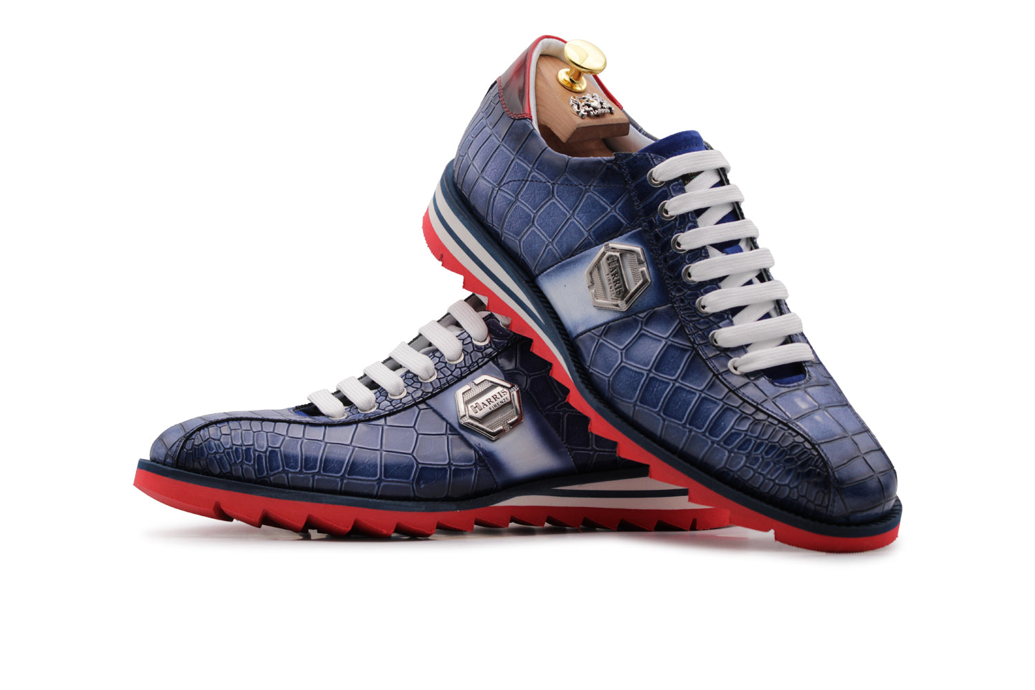 Esta zapatilla combina piel de becerro cepillada con relieve de cocodrilo de primera calidad en un vibrante azul claro degradado, iluminado por detalles blancos y un atrevido tacón de cuero rojo. La suela tipo corredor garantiza un confort dinámico, mientras que los accesorios de níquel confirman la singularidad de Harris.