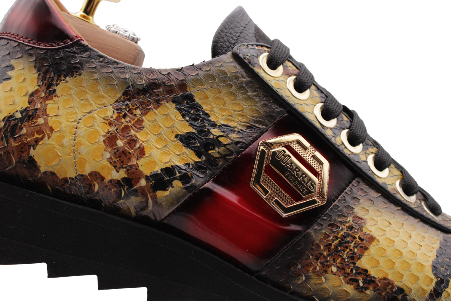 Esta zapatilla combina el precioso pitón amarillo con inserciones de piel cepillada en tonos rojos. Los accesorios dorados y la suela negra crean un contraste de color dinámico y lujoso.