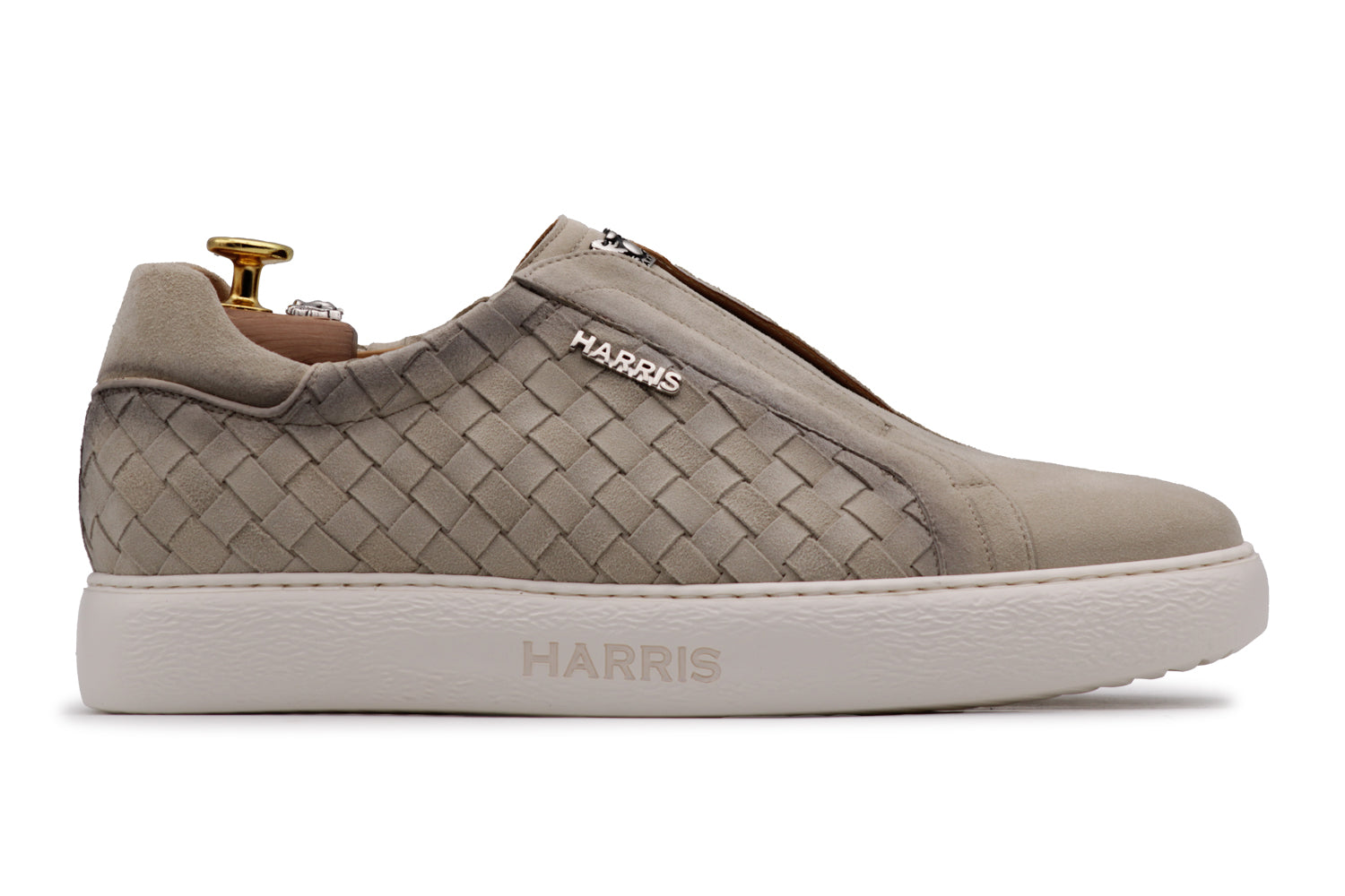 Esta zapatilla tipo caja presenta una parte superior de gamuza tejida suave y sombreada a mano para lograr un efecto aterciopelado. La suela marfil y los accesorios Harris completan un look casual impecable.