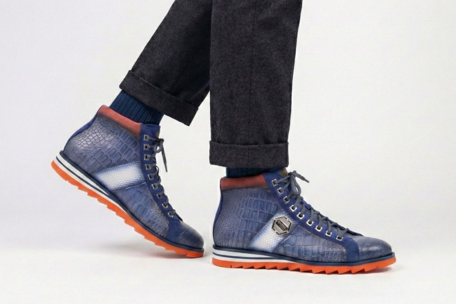 La base de piel de becerro cepillada con estampado de cocodrilo está enriquecida con detalles: los cordones, la lengüeta y el talón son de ante decolorado a mano, creando un irresistible juego de texturas. Accesorios en níquel para un look fresco y moderno.