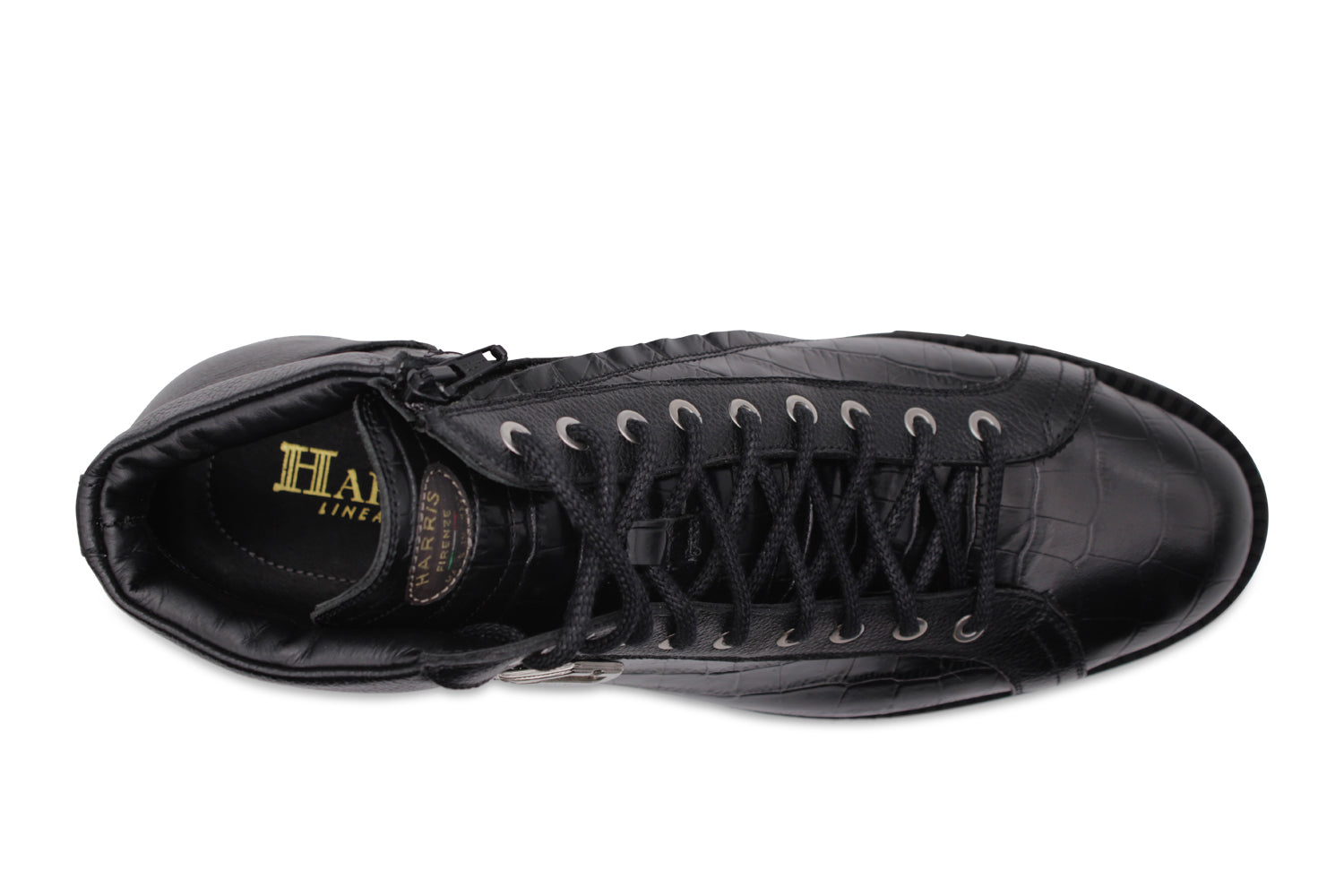 Cuir de veau pleine fleur imprimé effet crocodile avec détails en cuir effet élan noir, accessoires et semelle coureur en nickel. Une icône du style urbain et de l'élégance intemporelle.