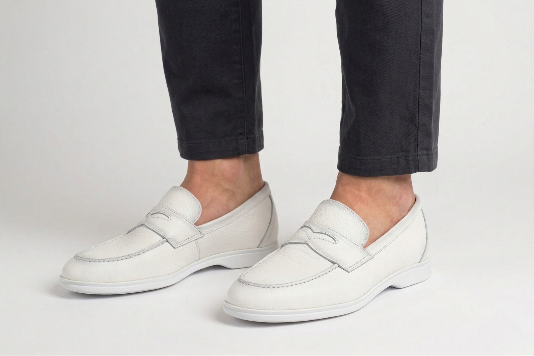 Pelle morbida effetto alce dipinta a mano per un look rilassato ma sofisticato. Dotato di suola in gomma leggera color bianco, questo mocassino sfrutta la tecnica Blake Rapid per il massimo benessere.