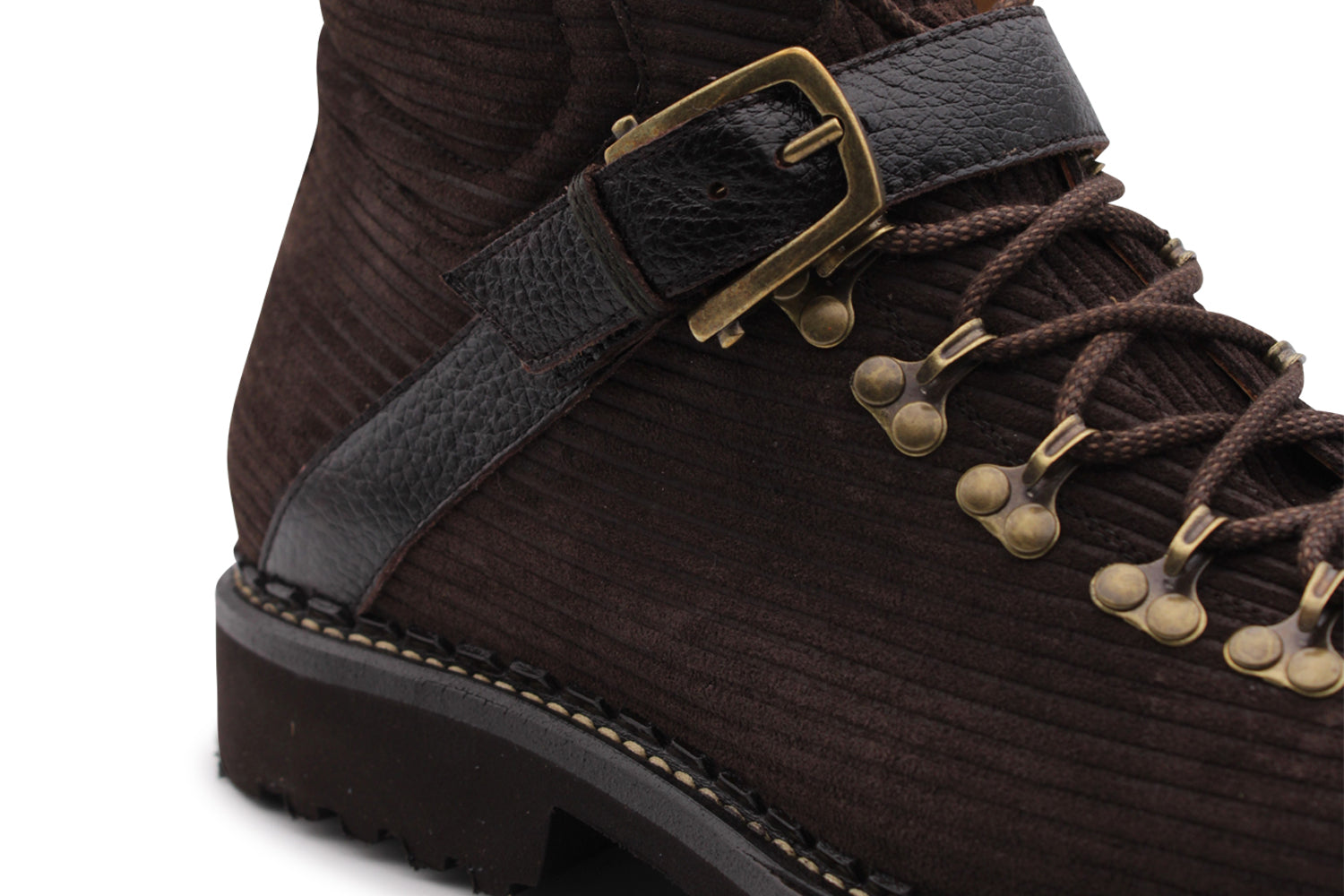 Polacchino in pelle scamosciata color testa di moro con effetto rigato, arricchito da dettagli in pelle e suola carrarmato in gomma. Il guardolo cucito e la lavorazione Blake Rapid uniscono artigianalità e spirito outdoor.