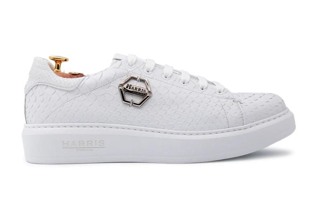 Eleganza e innovazione si incontrano in questa sneaker esclusiva, realizzata con pelle di vero pitone color roccia e pelle di vitello pieno fiore dipinta a mano. Ogni dettaglio è curato con maestria, creando un contrasto sofisticato e distintivo. La suola runner offre comfort e supporto ottimale, mentre il logo oro Harris aggiunge un tocco finale di lusso. Un capolavoro di artigianalità, pensato per chi cerca il massimo in ogni passo.