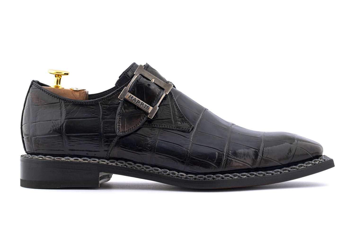 Raffinata monofibbia in pelle di vero coccodrillo, dipinta a mano in una calda tonalità marrone scuro con riflessi profondi. Le sfumature manuali valorizzano la texture naturale della pelle e l’eccellenza artigianale della lavorazione norvegese. Completa il modello una suola in cuoio, sinonimo di eleganza e tradizione.