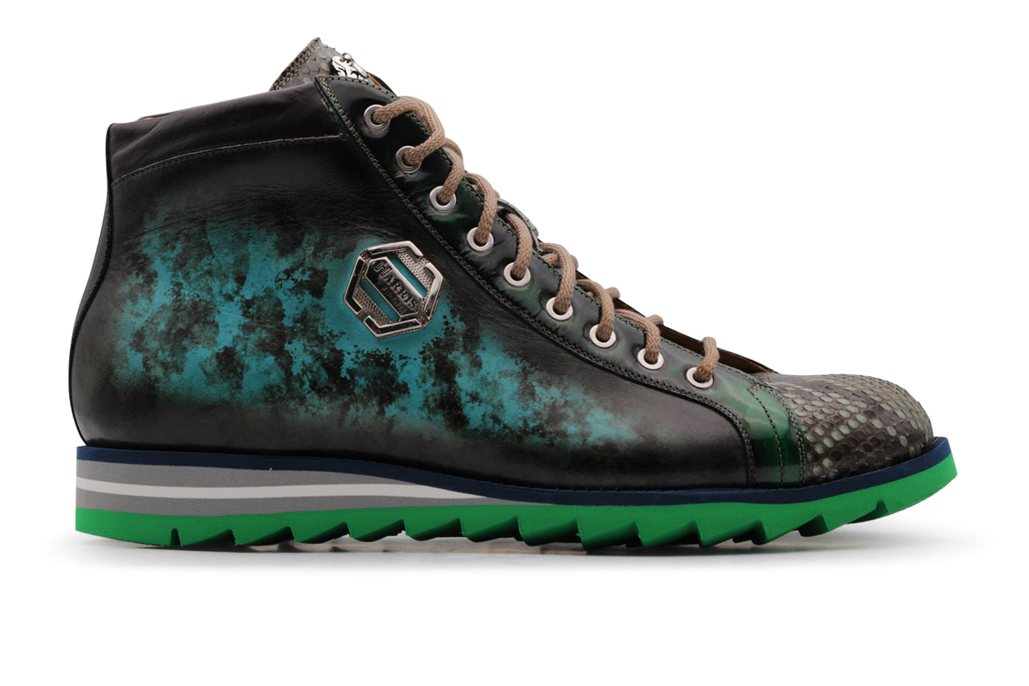 Questa polacchino Harris combina l’eleganza della vera pelle di pitone con il carattere deciso della pelle stampata effetto coccodrillo, sapientemente dipinta e sfumata a mano.
