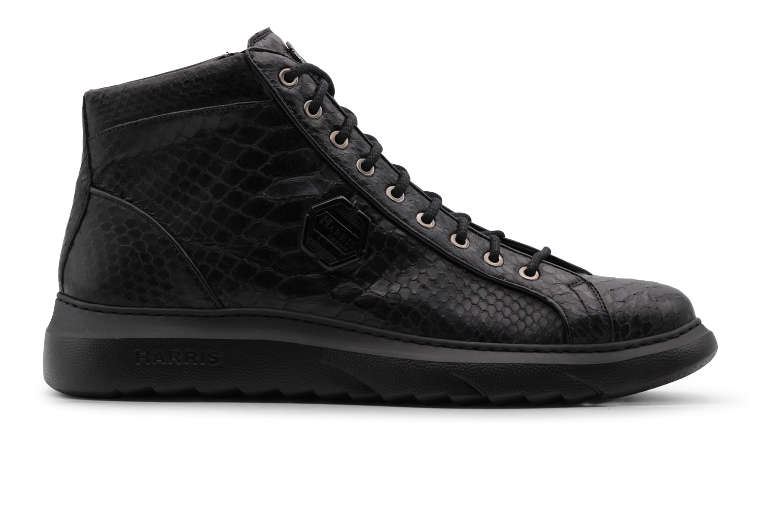 La linguetta in vera pelle di pitone, i dettagli in pelle spazzolata e gli accessori nichel Harris completano il design con eleganza.