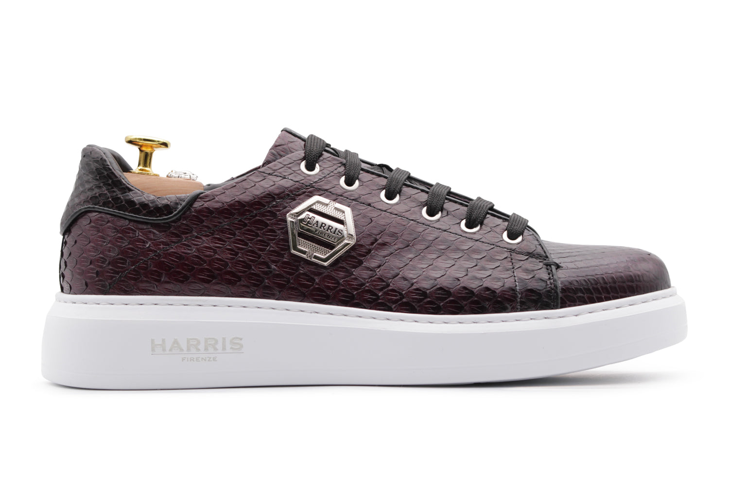 Realizzata in vera pelle di pitone nera, questa sneaker unisce l’essenza del lusso alla naturale versatilità dello stile urbano. La texture del pitone è arricchita dagli accessori in nichel, che creano un equilibrio tra lucentezza e profondità. A completare il deisgn la suola in gomma a cassetta per assicurare comfort duraturo.