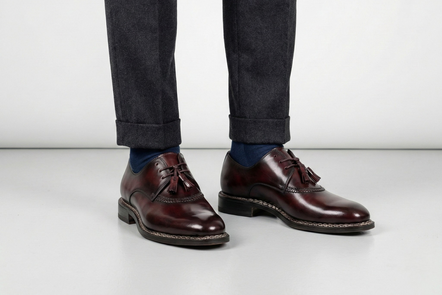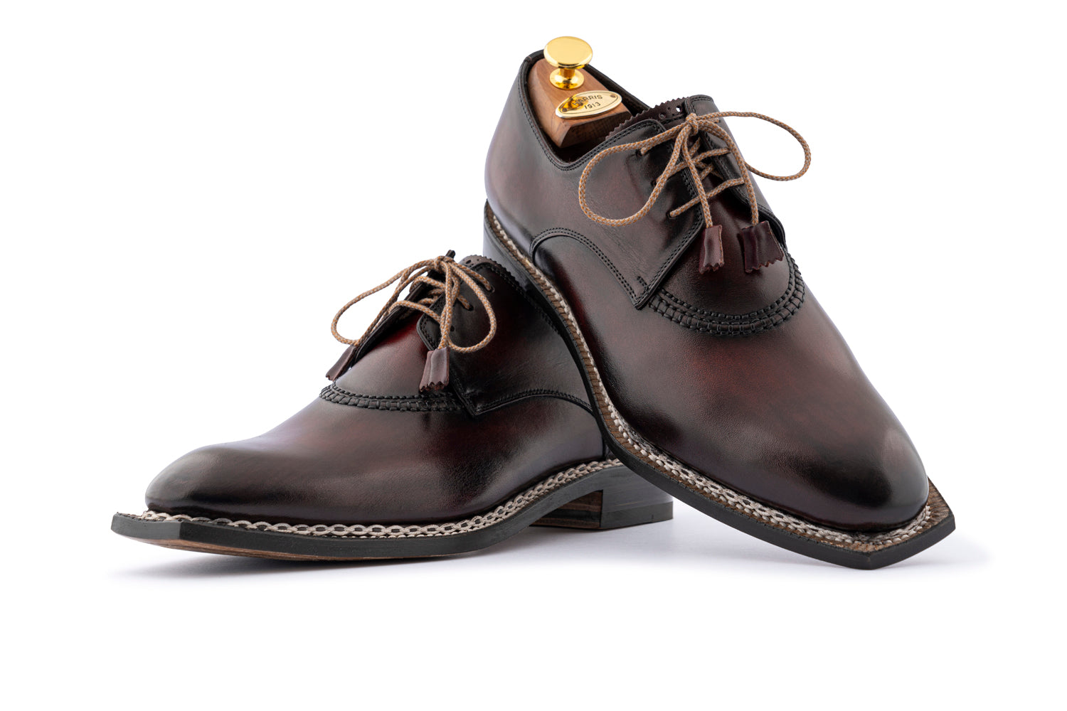 Derby in pelle di vitello dipinta a mano, cucitura artigianale sulla tomaia e suola in cuoio con inserto antiscivolo. Una scarpa che racconta una storia di passione e tecnica.