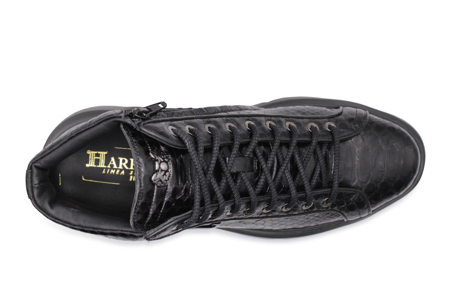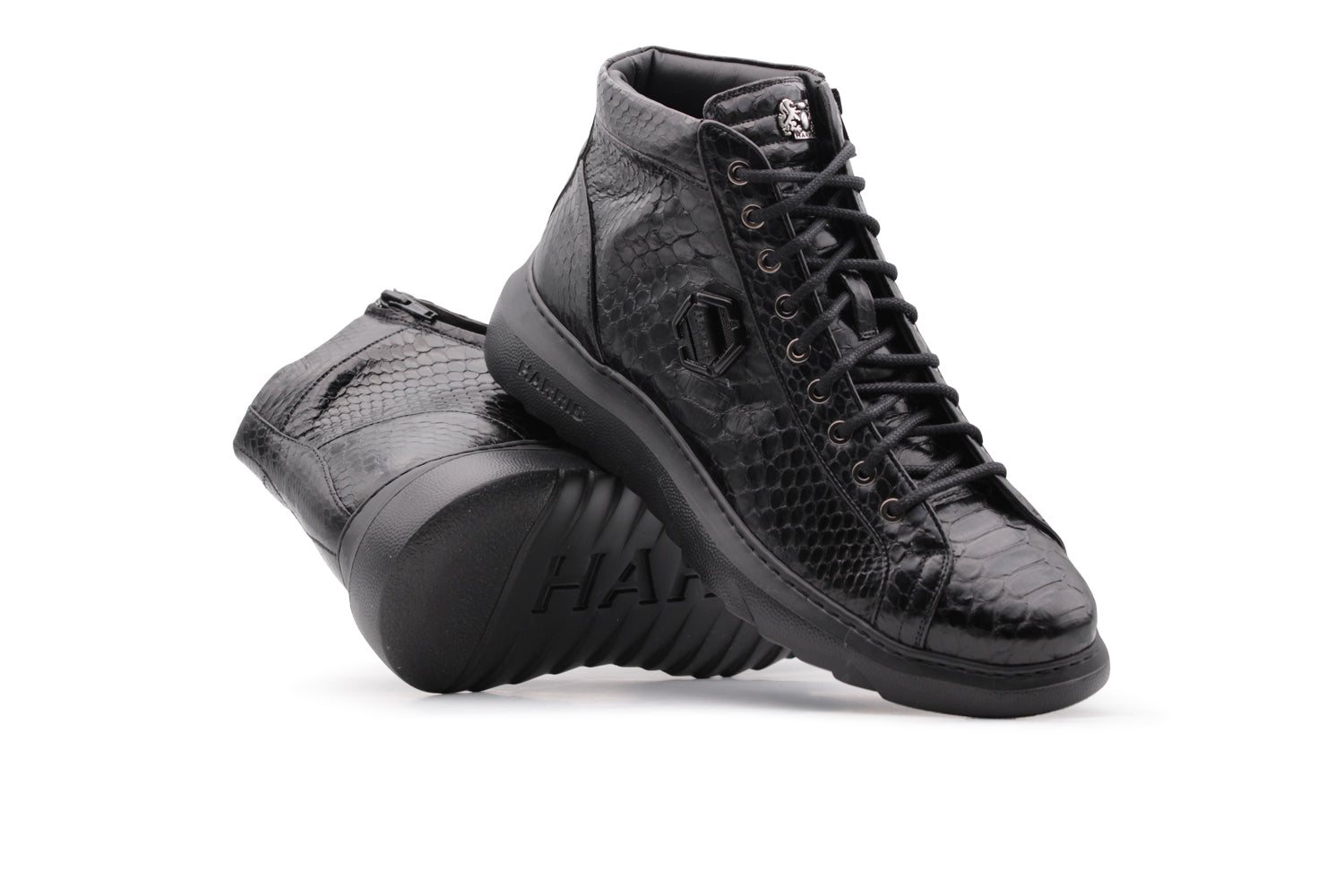 Simbolo di artigianalità e stile contemporaneo, questo polacchino in pelle di pitone nero combina materiali pregiati e dettagli esclusivi. La suola in gomma Innovazione garantisce comfort quotidiano, mentre gli accessori nichel e il logo in metallo nero aggiungono un tocco di eleganza discreta e ricercata.