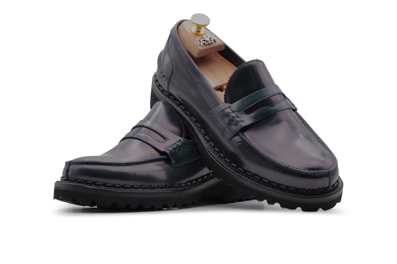 Horse-effect brushed leather. Black and blue blend in perfect balance. The antiquing treatment and the lug sole with stitched welt make this shoe synonymous with metropolitan elegance.