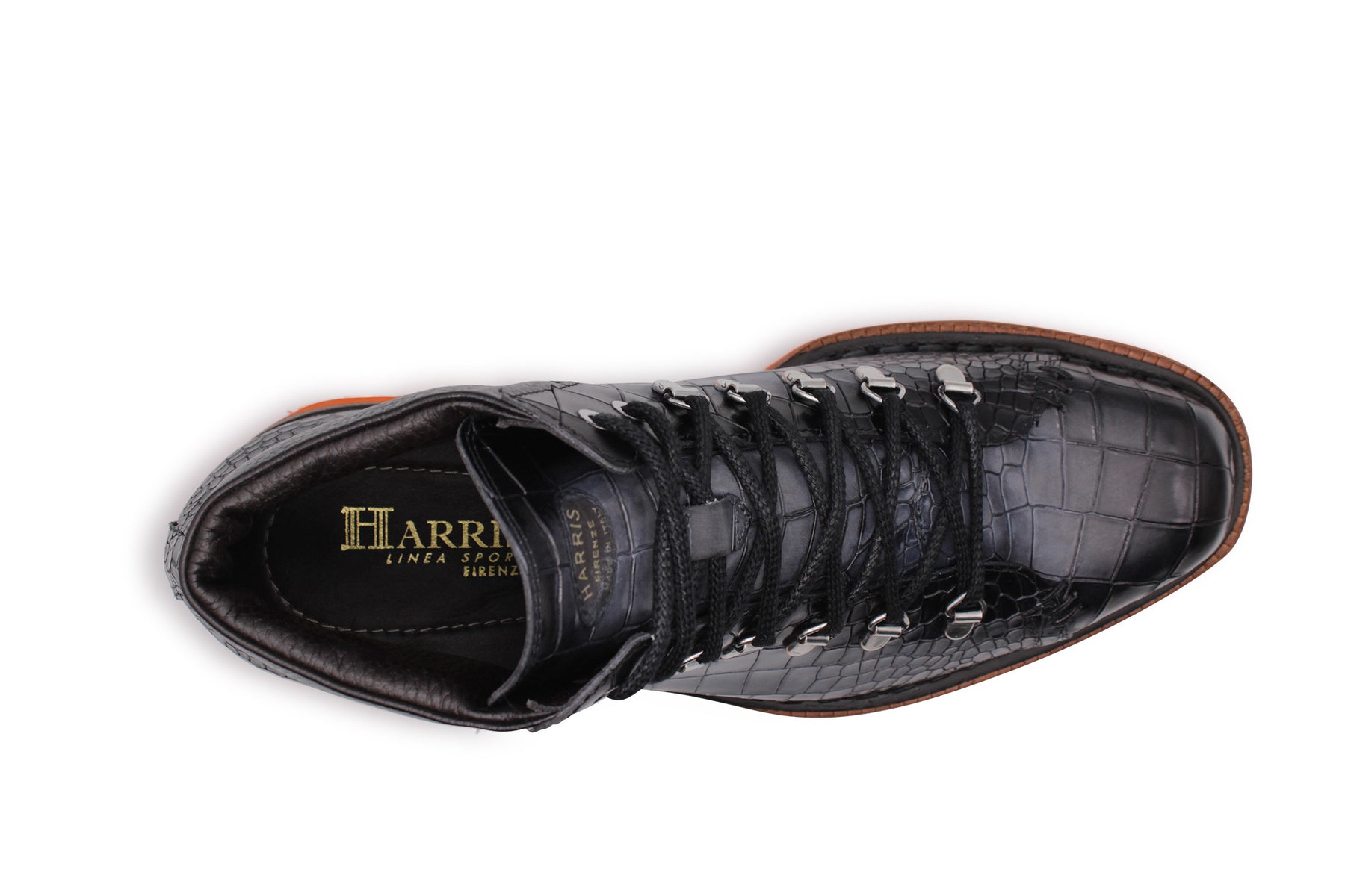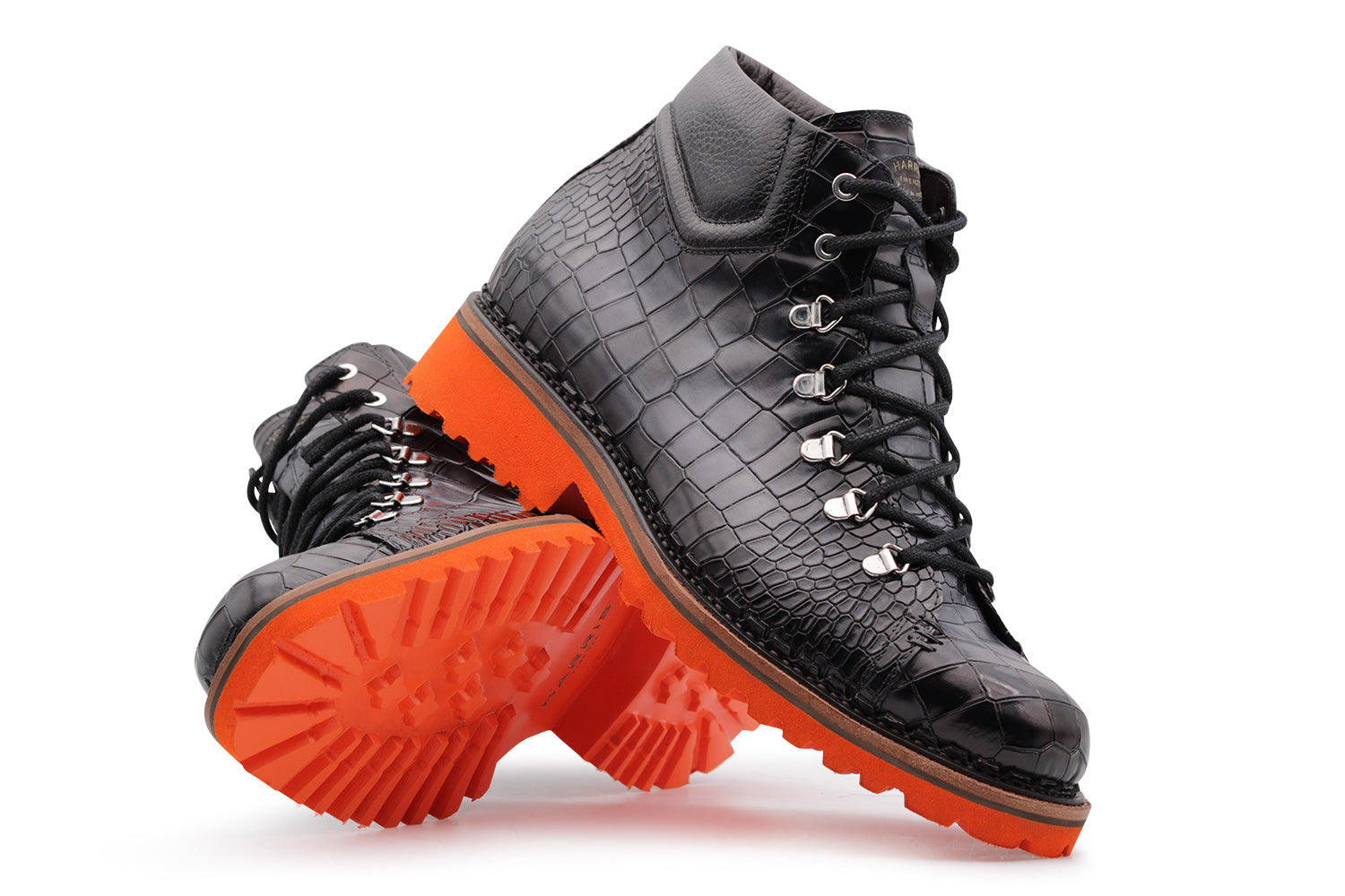 Pain -colored crocodile press veal boot painted and hand shaded. A model inspired by trekking, reinterpreted in an artisan key. Characterized by the metal hooks for the lacing, the neck with a padded padding and rounded tip. Tap -in contrasting tire sole. Made in Italy.
