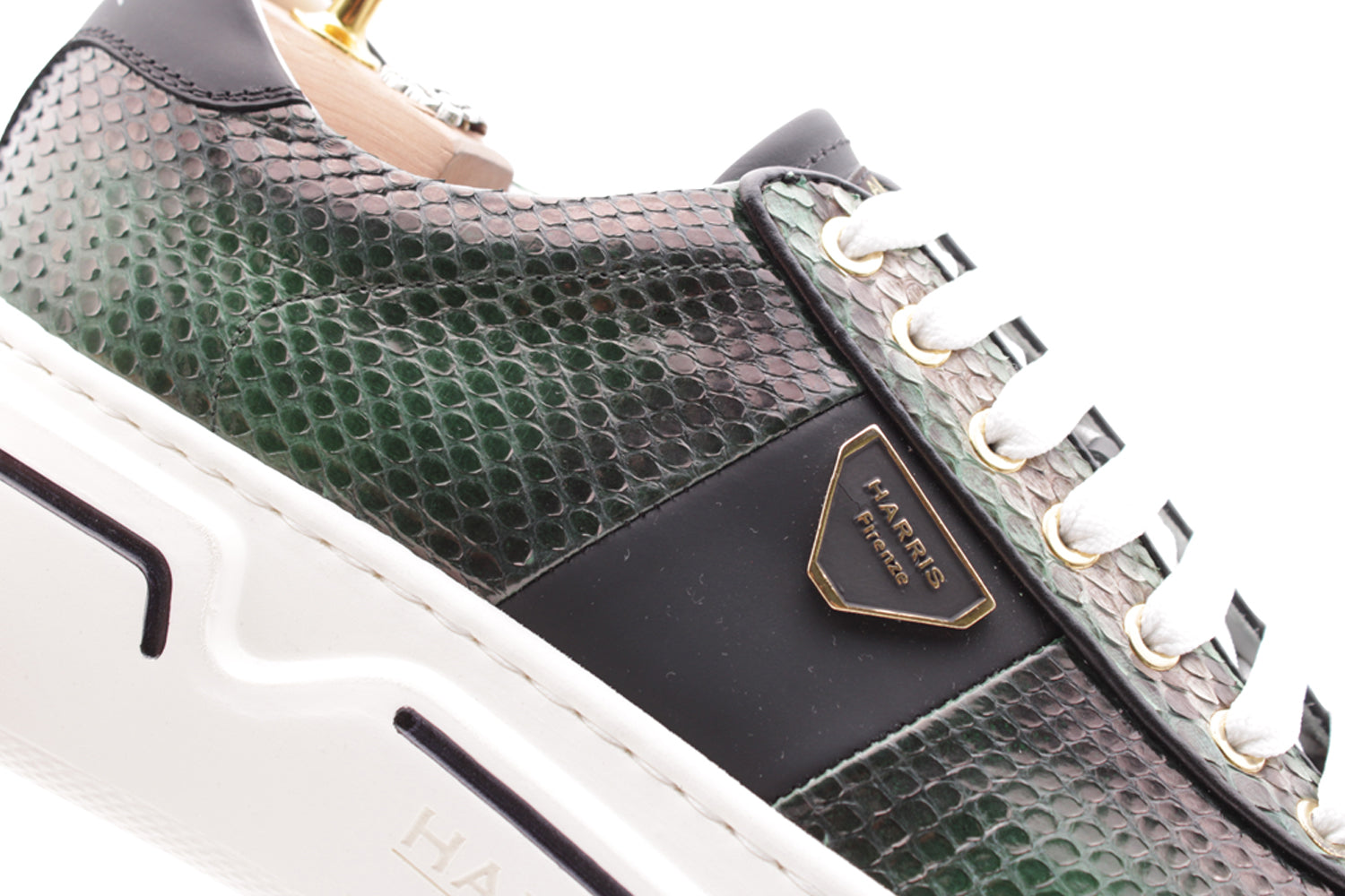 Realizzata in pregiata pelle di pitone nei toni del verde e del nero, questa sneaker è impreziosita da accessori in finitura oro che impreziosiscono il design. A completare il modello, la suola a cassetta Innovazione che assicura comfort e stabilità, esaltando uno stile che combina lusso, artigianalità e stile moderno.