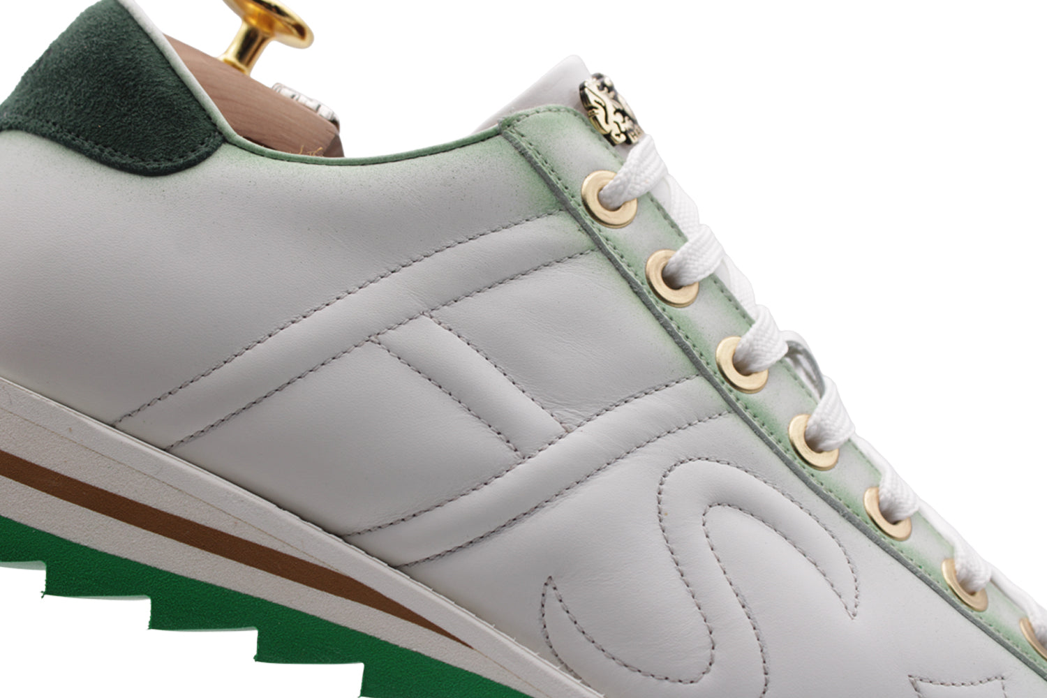 Essential and sophisticated, this shoe in white full-grain calfskin stands out for its green suede details, shaded with craftsmanship. The hand-shaded lacing demonstrates obsessive attention to detail, completed by the practicality of a high-quality runner sole.