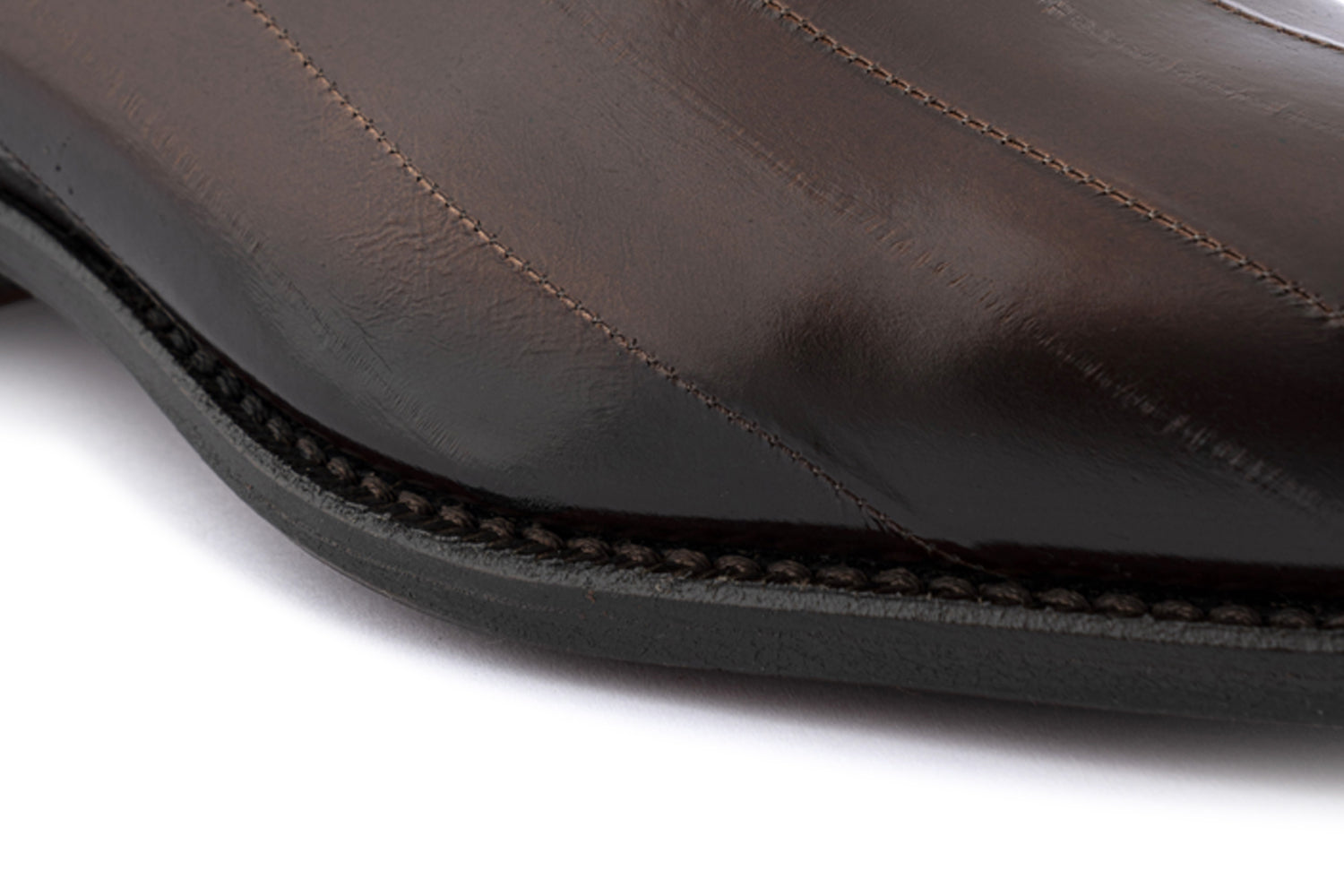 Linee essenziali e finiture impeccabili definiscono questa francesina in pelle di anguilla marrone testa di moro, impreziosita da sfumature scure che ne sottolineano la profondità. La tomaia intera senza cuciture e la lavorazione Blake Rapid rivelano una maestria discreta ma decisa, per un’eleganza autentica e duratura.